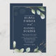 Celebre o seu amor por este eucalipto completo e marinho convite ao casamento azul, misturando o charme botânico natural com a sofisticação moderna. As folhas de cor aquosa Elegante eucalipto complementam o fundo profundo do marinho e a tipografia branca nítida para um design eterno. Um código de QR conveniente torna o RSVP ou o acesso ao site sem esforço, enquanto o formato de automail mantém tudo perfeitamente organizado — não é necessário um envelope. Perfeito para jardins elegantes, costeiros ou casamentos modernos clássicos.