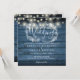 Um convite de casamento rústico com luzes bonito de cordas e uma delicada garland floral rústica desenhada à mão de folhagem botânica com tipografia de na moda, sobre um fundo de madeira rústica azul. Personalize com todas as suas informações especiais sobre o dia do casamento, incluindo seu RSVP, acomodações e detalhes adicionais. Projetado por Thisnotme©