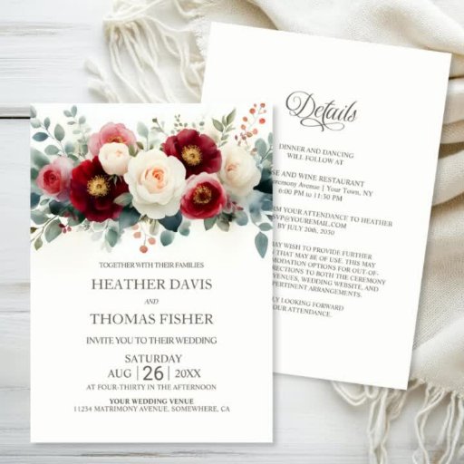 Convite Todos em Um Casamento Floral Branca e Borgonha