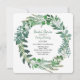 Na moda, chá de panela de estação inteira feito em verde e branco e em forma quadrada. Bonita trabalho de arte de coroa feita de samambaias e folhas verdes, decora toda a frente do convite, formando o quadro para a área de texto. Personalize todos os campos de texto para seu dia especial. Os produtos de casamento correspondentes estão disponíveis.