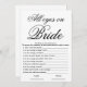 Torne seu chá de panela divertido e memorável com o Jogo de Chá de panela Simples All Eyes on Bride. Este jogo interativo e divertido foi projetado para trazer risos, alegria e um pouco de competição amigável para a sua celebração. O jogo "All Eyes on Bride" encoraja os hóspedes a se concentrarem na noiva, respondendo perguntas ou executando tarefas que giram em torno dela. É uma quebra-gelo perfeita que reúne todos. As instruções fáceis de seguir tornam este jogo adequado para todas as idades. Sem regras complicadas, apenas diversão direta que todos podem aproveitar. Os cartões de jogo apresentam um design limpo e elegante que complementa qualquer tema de chá de panela. As cores suaves e femininas e a tipografia saborosa adicionam um toque de sofisticação ao seu evento.