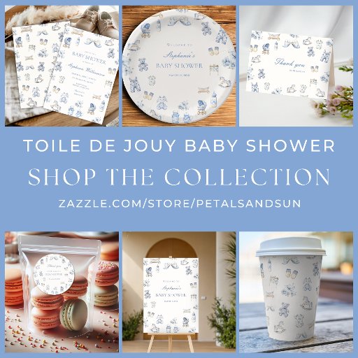 Whether you’re planning a storybook-style celebration or a vintage-nursery-themed shower, this Toile de Jouy invitation sets the perfect tone.