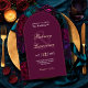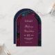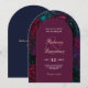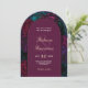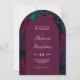 Um convite de casamento floral em tom de joia luxuoso e arqueado, apresentando ricas flores em burgundy, roxo e verde, lindamente dispostas em torno de uma moldura arqueada elegante sobre um fundo azul profundo. O ousado design botânico e a paleta de cores dramáticas criam um visual romântico e sofisticado, perfeito para cerimônias formais, celebrações noturnas e casamentos de jardim sofisticados. Este convite único em forma de arco adiciona um toque moderno, destacando flores vibrantes e elegância atemporal.