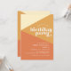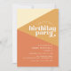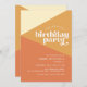 Convites de festas de aniversários de cor de areia e terra com caracteres retrorreflectores e uma paleta de cor amarela, cor laranja e mutada. Personalizar com qualquer idade. Convites relaxados e divertidos para aniversários retrortemáticos.