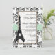 Um convite de casamento parisiense elegante e sofisticado com tema francês, com uma borda floral damasco preto e branco antigo, moldura rendilhada com acabamento dourado e design de fita impressa em tom verde hortelã e a Torre Eiffel. Personalize com os nomes da noiva e do noivo no verso. Criado por Chrissy H. Studios, LLC. Todos os Direitos Reservados.