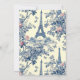 Adicione um toque parisiense à sua celebração com este convite de chá de bebê da Torre Eiffel Toile Francesa. Com uma clássica impressão azul toile de Jouy com flores, borboletas e sotaques da Torre Eiffel, este design é perfeito para chás de bebê elegantes e caprichosos. Situado em um fundo de creme suave e emoldurado com um layout de texto moderno, é ideal para mamães estilosas. Personalize facilmente os detalhes do seu evento e escolha o acabamento de papel favorito.