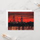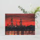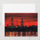 Nesta paisagem marinha em aquarela industrial, o céu está banhado de vermelho após um pôr do sol brilhante em Portland, Maine. Torres de perfuração em construção criam silhuetas marcantes contra os vermelhos e laranjas brilhantes. Pontos de luz brilham, refletindo na água do oceano enquanto o trabalho continua noite adentro.