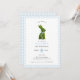 Convite de aniversário infantil de coelho de topiaria pintado à mão fofo e sofisticado com borda de ginga azul e branca.