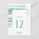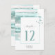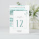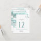 Um traço de pintura em aquarela, em tons cintilantes de verde de vidro do mar com respingos de rosa suave, acentua as peças deste belo conjunto de casamento. O cartão de número da mesa de casamento mostrado aqui também apresenta caligrafia elegante manuscrita e um modelo para adicionar facilmente seus próprios nomes e data de casamento. Procure ID886 para ver outras peças e opções de cores para este conjunto.