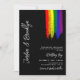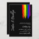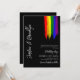 Convite de casamento lgbt arco-íris com a bandeira do orgulho arco-íris desenhada com traços irregulares contra um fundo preto. Seus nomes em uma escrita à mão ao longo do lado esquerdo do convite de casamento do orgulho.