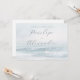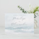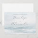 This wedding invitation features a serene and elegant design with a soft pastel color palette of light blue and white, creating a calming beach theme. The watercolor-like ocean waves in the background enhance the tranquil mood, while the centered text is arranged for balanced composition. Sophisticated script typography highlights the names, complemented by clean serif fonts for additional details, offering a harmonious blend of modern and timeless styles. Perfect for couples seeking a refined and peaceful celebration atmosphere.