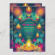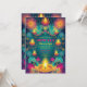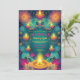 A frente do convite apresenta um fundo verde-suave e turquesa que cria um ambiente calmo e convidativo. Padrões decorativos ao estilo hindu traem o design, formando uma fronteira detalhada que acrescenta um toque de elegância cultural. No fundo, uma fileira de lâmpadas Diya brilhantes repousa graciosamente, iluminando a cena com sua luz suave e quente. Os detalhes do evento são escritos em um roteiro refinado e elegante que se mistura perfeitamente com a paleta de cores pacífica. A parte de trás do cartão espelha os tons verdes e turquesas tranquilos, oferecendo espaço para textos personalizáveis e desejos de Diwali, cercados pela mesma fronteira do ornamentado. Esta design é perfeita para uma celebração em Diwali que abraça a tranquilidade e a tradição.