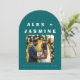 The Aesthetic: Make a sophisticated statement with our signature arched wedding invitation. This design features a striking color-block of Transformative Teal—the hero hue of 2026—set against a crisp, modern off-white. The front showcases bold, editorial-style typography that commands attention, while the reverse side reveals a "Digital Futurism" geometric motif, providing a sophisticated surprise when guests flip the card over.