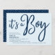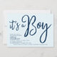 Celebrar a futura mãe ou os futuros pais com este convite para o Chá de fraldas na moda com as palavras "É um Menino" em um roteiro de pincel azul moderno contra um fundo azul claro. A placa tem um padrão vermelhos e brancos esfolados no lado traseiro. Personalize-o substituindo o texto do marcador de posição. Para obter mais opções, como alterar a fonte e seu tamanho/cor ou o espaçamento entre letras, clique no botão "Personalizar". *Observe que a Marca d'água do Zazzle que aparece na visualização de zoom NÃO aparecerá no produto impresso final. © Rosewood e Citrus