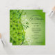 Convites chiques para o Dia de São Patrício com muitos trevos e trabalho de trepadeira branco e verde em um fundo gradiente verde.