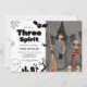 O cartão de convite de aniversário da menina do Halloween com ilustrações de um fantasma, aranha, morcego e velas. O título é "Três espíritos."