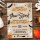Estes convites divertidos e na moda são perfeitos para qualquer um que comemora um aniversário de 3 anos neste Halloween. O design apresenta tudo assustador de um gato preto com morcegos voadores para uma teia de aranha, fantasmas, vassoura-bruxa, crânio e osso, bola mágica de vidro e uma abóbora-de-jack-o-lanterno em laranja, branca e preta em um fundo de efeito de papel kraft de tendência. É fácil personalizar o texto modelo, e os seus convidados do partido estarão com medo quando receberem estes convites pelo correio!