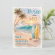 Crie ondas com este convite de aniversário de praia retrô "Três no Mar" - perfeito para qualquer pequeno surfista que está completando três anos! Este design pintado à mão com aquarela apresenta uma sonhadora costa tropical ao pôr do sol, completa com pranchas de surfe na areia, conchas espalhadas, ondas do oceano ondulando, palmeiras balançando, um golfinho brincalhão saltando pelas ondas e uma gaivota voando alto. Tons turquesa e laranja queimado dão a todo o design uma vibe de surfista vintage.