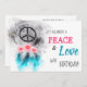 Também tem um bosque legal artístico e grunge criativo Hippie Gypsy Sign Symbol de Paz com algumas Flores de Margarida Rosa e Penas Azuis Turquesa desenhadas para este adorável bosque floral e de penas Qualquer idade de Boomer, Teen, a Crianças CONVITES DE ANIVERSÁRIO *