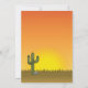 A ilustração original do desenho animado de Destei de um dinossauro triceratops, de cor marrom e giro, em pé na cena do deserto durante o pôr do sol. Há algumas rochas, um cacto e uma planta em cena. A grama está seca e pintada em castanho. O sol está se pondo bem atrás do dinossauro criando uma matiz laranja avermelhada para o céu. Personalize as áreas de texto de exemplo com os detalhes do seu partido.