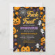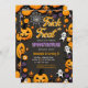 Faça truques ou trate a festa do Halloween retro boho estilo modelo convite convite descarregamento instantâneo, lindas lanternas Jack-o-lanternas, fantasmas de bebês, doce, cor laranja de cinza escura