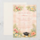 A soft parchment backdrop is framed by lush tropical greenery and coral hibiscus blooms, creating a fresh yet elegant celebration aesthetic. Delicate plumeria accents and airy palm leaves bring a warm, destination-inspired feel, while the classic typography keeps the layout refined and timeless. A subtle graduation cap detail grounds the design with just the right academic touch.