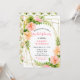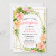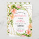 This fun and whimsical bridal shower invitation features watercolor pink and orange hibiscus flowers, monstera leaves and foliage on a gold geometric frame. The text combines handwritten script and serif fonts for a stylish and modern look. This is perfect for a spring or summer rustic bridal shower.