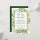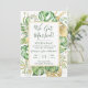 Este convite de recepção de casamento tropical elegante apresenta folhas de palmeira, filodendro e samambaia em verde e dourado. Uma moldura dourada elegante destaca o texto em verde escuro. Salpicos dourados acentuam este design botânico exótico e trazem um toque de capricho moderno ao convite. "Casamos!" junto com os nomes da noiva e do noivo estão na parte superior. Os detalhes dos votos de casamento e a localização e data da recepção estão detalhados abaixo. As informações de RSVP estão no verso do convite.