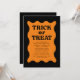 Defina o tom para sua festa de Halloween com estes convites de Trick ou Tratar cor de laranja e preto. O design apresenta "Trick or Tratat" em letras negrito, preto, retro desenhado por uma borda laranja em forma de ranhura sobre um fundo preto. Personalize este convite da festa de Halloween inspirado na vintage com os detalhes do seu evento para um design divertido e atraente que os seus hóspedes não esquecerão.