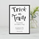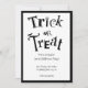 Um design simples e divertido com "Trick or trata" em uma mistura de fontes divertidas em um esquema monocromático de cores preto e branco. Cada letra é embelezada por ilustrações de halloween como aranhas, teias de sabugo, chifres do diabo, morcegos e uma abóbora. Abaixo, há espaço para você preencher os detalhes da sua festa em preto. No verso, há mais espaço se você quiser incluir detalhes sobre o menu da sua festa ou as instruções para o seu local e informações de RSVP.