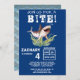 Convide amigos e família para se juntarem a vocês para uma mordida com este convite de aniversário de tubarão fofo. Esta design apresenta um fundo azul escuro com um tubarão feliz e risonho com algas marinhas no oceano. A parte traseira da placa apresenta um padrão de escala de sereia do cozinheiro em tons de azul. Personalize este item com o nome, a idade, a data, a hora, o endereço e as informações de rsvp. A fonte e a cor são personalizáveis. Perfeito para a festa de aniversário de um menino. Precisa de ajuda? Apenas entre em contato conosco e ficaríamos felizes em ajudá-lo com sua personalização especial.