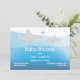 Um chá de fraldas de convite mostrando um tubarão-mãe e bebê. Os dois estão flutuando num oceano azul. O texto é personalizável. A parte de trás do convite tem um padrão de tubarão. Tubarões-de-costa sob o convite ao Chá de fraldas do mar