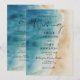 Este convite de casamento elegante de praia com oceano azul em aquarela pode ser personalizado com suas informações em tipografia moderna e todas as informações especiais do seu dia de casamento no verso, incluindo seu RSVP, acomodação e detalhes adicionais. Projetado por Thisisnotme