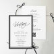 Convite de casamento preto e branco limpo e moderno com um layout elegante e código QR de RSVP opcional. Perfeito para um estilo de casamento minimalista e atemporal—edite os detalhes para combinar com o seu dia e mantenha tudo com aparência polida e sem esforço.