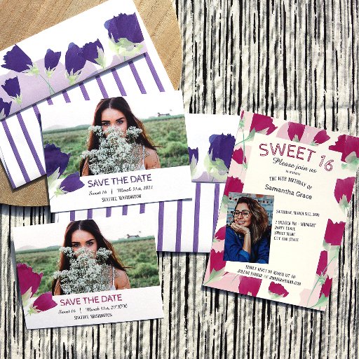 Doce 16 convites de festas de aniversários com tulipas roxas são versáteis para paletas de lavanda ou lilás. Combinar envelopes, adesivos e cartões de agradecimento é um toque final para convites de festas de aniversários roxos. Perfeito para primavera ou festas de verão.