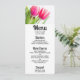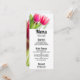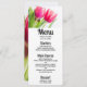 Cartão de cardápio de casamento com uma bela fotografia de primavera com 2 tulipas cor-de-rosa e folhas verdes brilhantes.