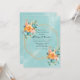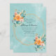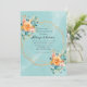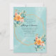 Design apresenta um colorido impresso com elementos florais em tons de turquesa e laranja sobre folhas verdes e florações de peônias e rosa. Excelente para as comemorações do casamento!