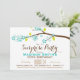 Convite de festas surpresa de aniversário bonito, colorido e moderno com turquesa, flores azuis-claras, folhas de verde limão, galho castanho sobre fundo branco. Excelente ano redondo para primavera, verão, outono ou festas de aniversário surpresa de inverno. Design de tendência neutra para homem ou mulher, menino ou menina. Na moda, convite clássico para qualquer aniversário de um marco adulto ou adolescente, incluindo 16, 18, 21rua, 30, 40, 50, 60, 70, 75, 80, 85, 90, 95, 100 anos.