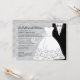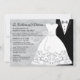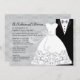 Um belo convite com um vestido de noiva com bordado de saia e uma fita fluente, cinzas, ao lado de um smoking preto. Excelente para todas as comemorações do casamento.