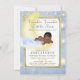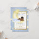 O garoto afro-americano Twinkle reluziu o convite para chá de fraldas de estrelas com adorável menino afro-americano em uma bonito lua amarela com nuvens suaves segurando uma estrela amarela brilhante em um bonito azul e amarelo-estrela azul e azul-estrela e fundo de folhas douradas. Você pode personalizar facilmente este belo convite de chá de fraldas de estrela cintilante para seu evento simplesmente adicionando seus detalhes no estilo de fonte de sua escolha. Este é um design impresso sem folha de alumínio real, brilho, etc.