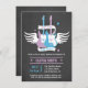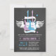 Este na moda, modesto e legal convite para chás de fraldas tem um par de guitarras elétricas lilás e azuis com um par de asas brancas atrás dele. O cartaz ao redor do violão diz "Rock a Bye Chá de fraldas" que é uma surpreendente torção de trocadilhos para uma canção de ninar clássica. As cinzas escuras têm uma design de textura clara. Ao contrário, há um clássico registro vinílico com notas musicais e estrelas para decorações. Este convite é perfeito para qualquer celebração de chá de fraldas de rock and roll, música ou rock star para que a mãe seja quem espera gêmeos! Personalize facilmente com os detalhes do seu chá de fraldas.