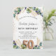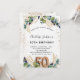 Para uma 50ª festa de aniversário. Um fundo branco decorado com verde de eucalipto e folhas de ouro. Ouro falso brilho, brilho. Personalize e adicione seus nomes e detalhes do casamento. Letras pretas e ouros coloridas. O número 50 é escrito com a fonte do estilo do balão. Traseira: fundo branco e cintilações brilhantes com falso ouro.