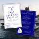 Celebre a sua "última vela antes do véu" com este convite de fim de semana de despedida de solteira de temas náuticos, ilustrado em tons oceânicos de azul e branco nítido. Apresentando detalhes encantadores desenhados à mão de um boné, âncora e barco clássico do capitão. Ele evoca o mar à beira do mar com um toque de sofisticação. A frente introduz a celebração do fim de semana com uma elegância maravilhosa, enquanto as costas descobrem um itinerário maravilhosamente organizado para guiar a sua tripulação através de cada momento inesquecível.