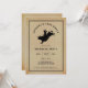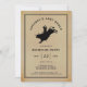 Celebre os últimos dias de liberdade do noivo com este convite de despedida de solteiro "Último Rodeio". Com um fundo estilo pergaminho vintage e uma silhueta preta ousada de um peão de rodeio, este cartão captura uma estética ocidental robusta perfeita para uma noite fora ou uma viagem ao rodeio. A tipografia clássica e a moldura de borda dupla lhe dão um visual atemporal e masculino. Este modelo é 100% personalizável: atualize facilmente o nome, data, hora e local para se adequar ao seu evento específico. Se você está indo para um rodeio de verdade ou apenas organizando um churrasco no quintal com os amigos, este convite define o tom perfeito para um fim de semana selvagem.