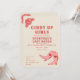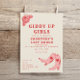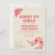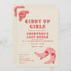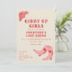 Convites de despedida de solteira com "Giddy Up Girls" e texto "último rodeio" decorativos em rosa e vermelho, ilustração de rosa e botas de cowgirl rosa com corações. O fundo é branco esbranquiçado. O verso apresenta o itinerário.