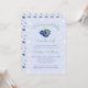 Este convite para o chá de fraldas tem um tema doce e brincalhão de mirtilo. O fundo é de pasta azul, decorada com flores brancas dispersas e mirtilos brilhantes com folhas verdes. No topo, numa fonte divertida e cursiva, o texto diz: "Um bebê doce de baga está a caminho!" Abaixo, em uma mistura de fontes elegantes e divertidas, os detalhes do evento são listados, incluindo o nome, data, hora, local, informações de RSVP e detalhes do registro de presentes da honraria. O design geral é charmoso, quente e perfeito para celebrar a chegada de um pequeno menino!