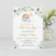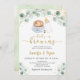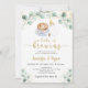 Este convite apresenta cor de água verde com café, uma garrafa de bebê e acentos de folha de ouro.