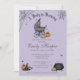 Um design de chá de fraldas neutro em tinta preta, desenhado à mão, "A Baby is Brewing". Possui uma antiga carruagem para bebês, corvo preto, caldeirão borbulhante, chapéu de bruxa, abóboras e teias de aranha sobre um fundo roxo claro. As costas apresentam um padrão de gingham roxo e laranja giro.