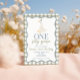 Um ganso de bobo! primeiro aniversário com ganso, um retângulo azul poeirento e um texto verde de sábio.