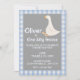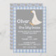 Convide sua família e amigos com este garoto personalizável, um convite para primeiro aniversario de festa de ganso de bobo. Ele apresenta uma ilustração aquosa de um ganso branco giro com uma borda de gingham azul bebê e padrão de retalhos coração. Personalize adicionando seus detalhes. Você pode alterar a(s) fonte(s). Design azul, branco e cinza.